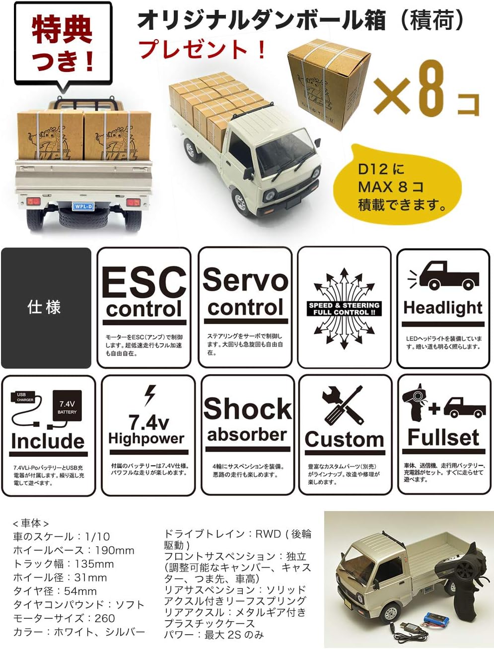 WPLJAPAN [D12] WPL 正規品 技適マーク付き 1/10スケール 軽トラ RCカー トラック バッテリー付き(ホワイト)