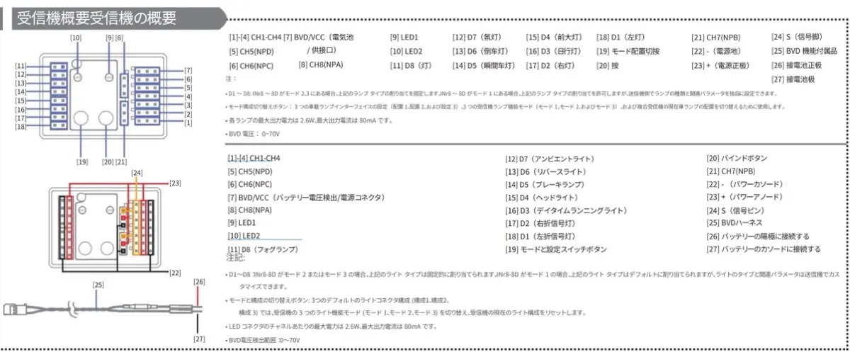 - D1〜D8 端子があり、それぞれにライト(ターンシグナル、ブレーキライト、リバースライト、ヘッドライト、デイライト etc.)の制御が割り当てられている。