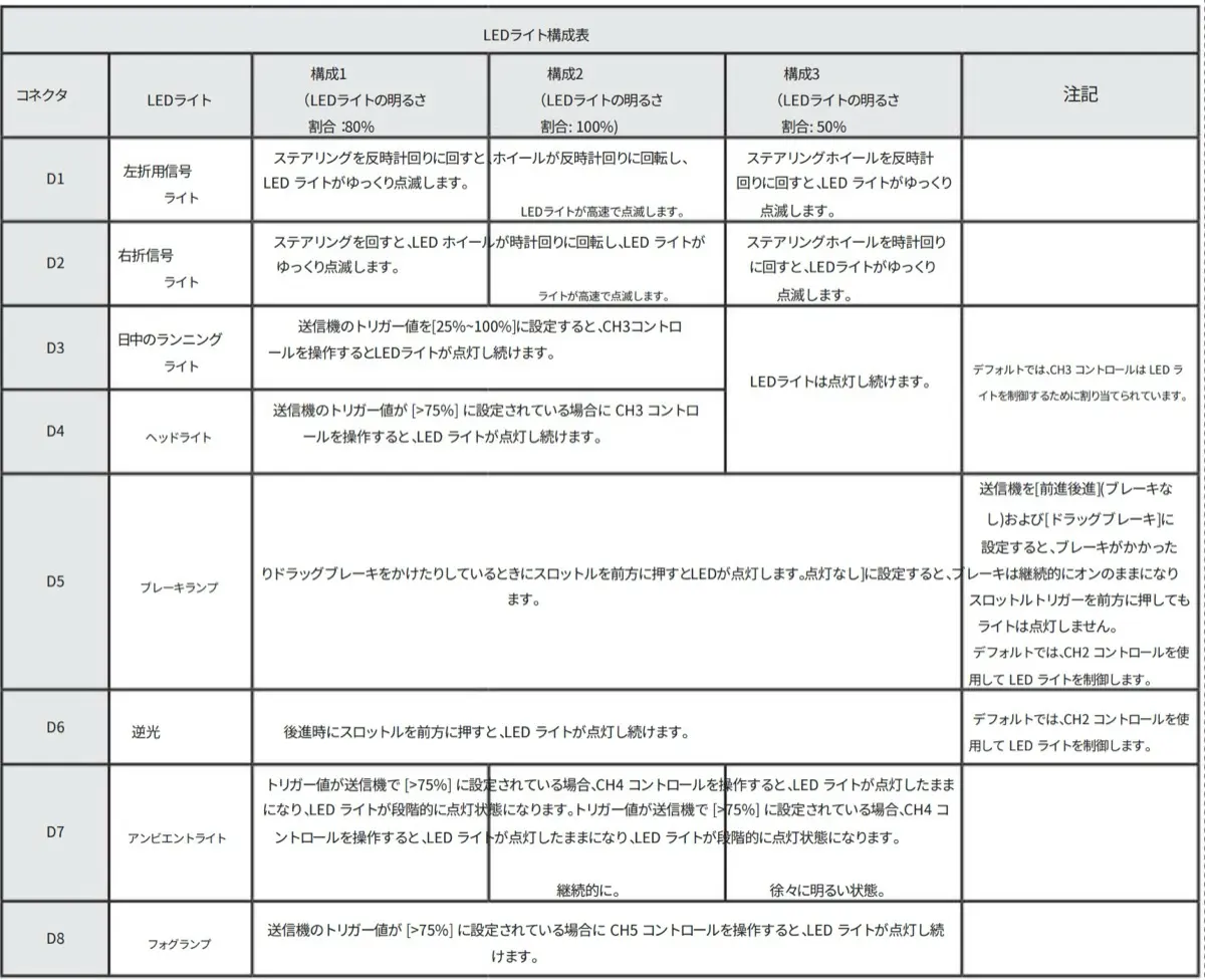 ちなみにコチラはAFHDS3プロトコルなので対応している送信機はNB4系などになります。ただし、LEDコントロール制御の3つあるモードのうちモード2と3を利用する場合、AFHDS3以外の受信機をケーブルで接続することで、同時制御ができるようになるそうです。ちょっとどういう用途があるのか不明ですが・・・