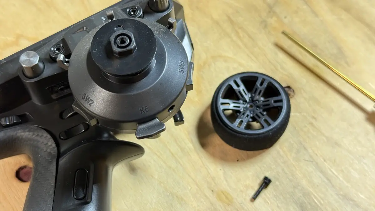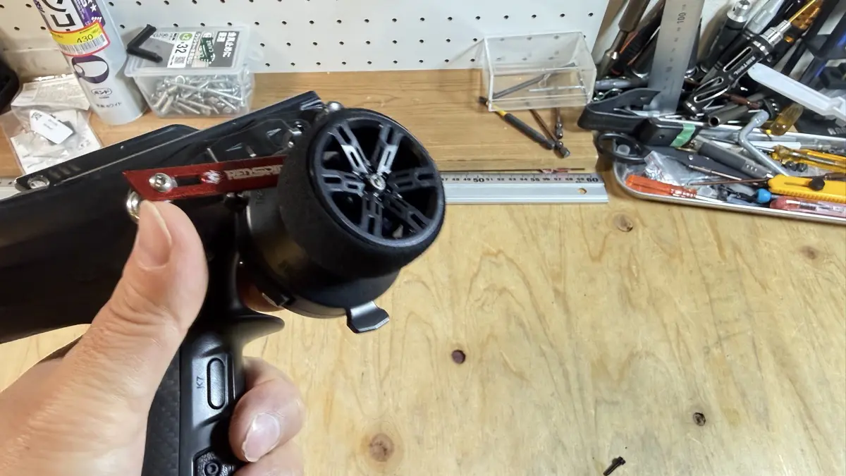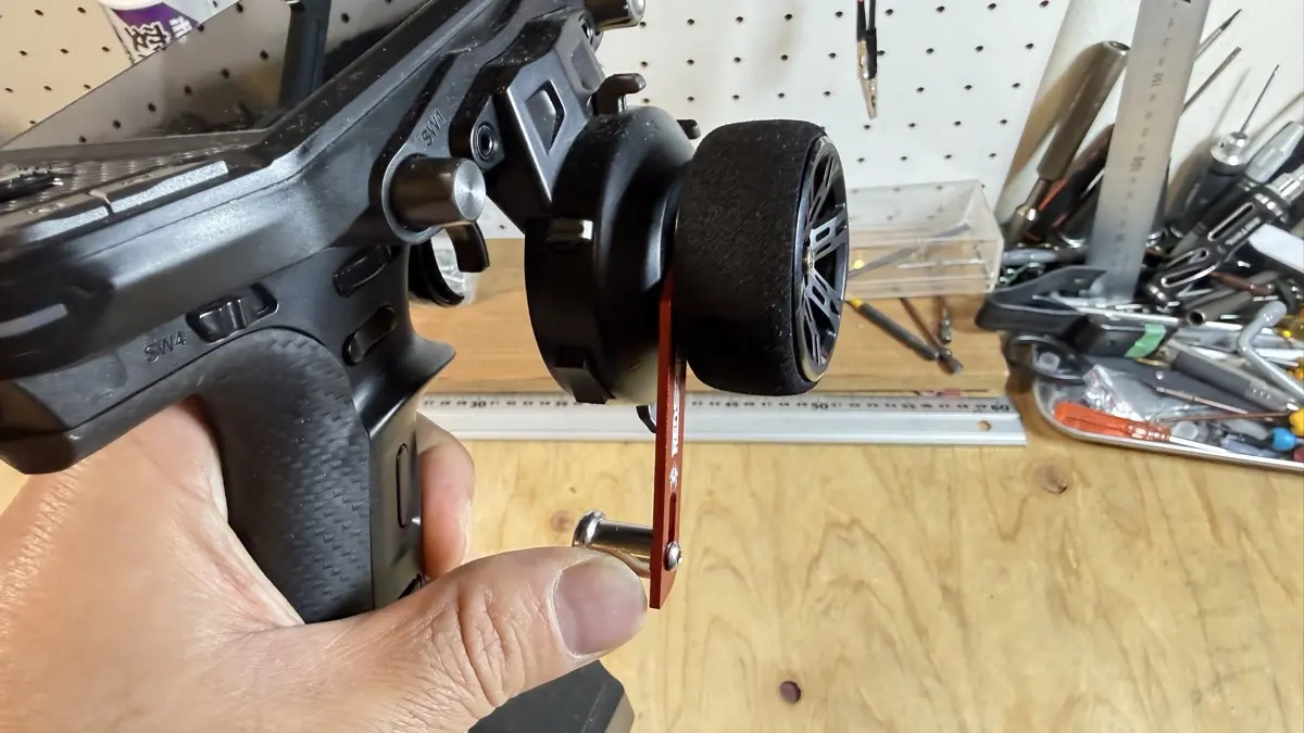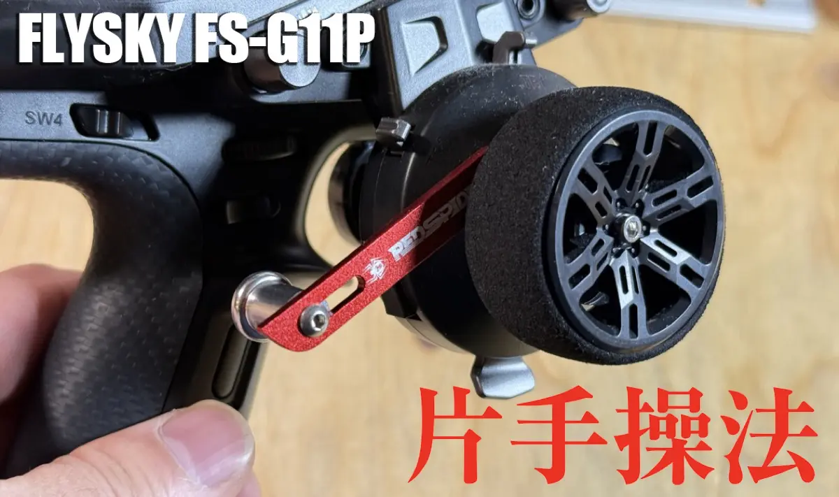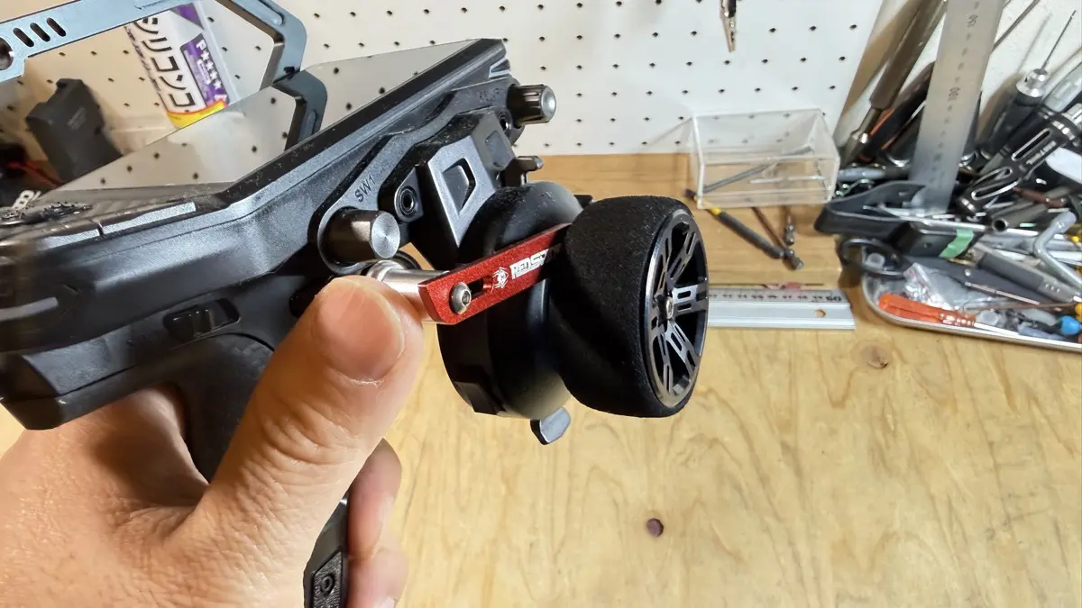でも、プロポによっては、というか殆どのプロポは親指を伸ばしてもギリギリ届く距離にステアリングホイールがあり、これでも操作ができないことは無いですが、細かい操作は無理なんです。