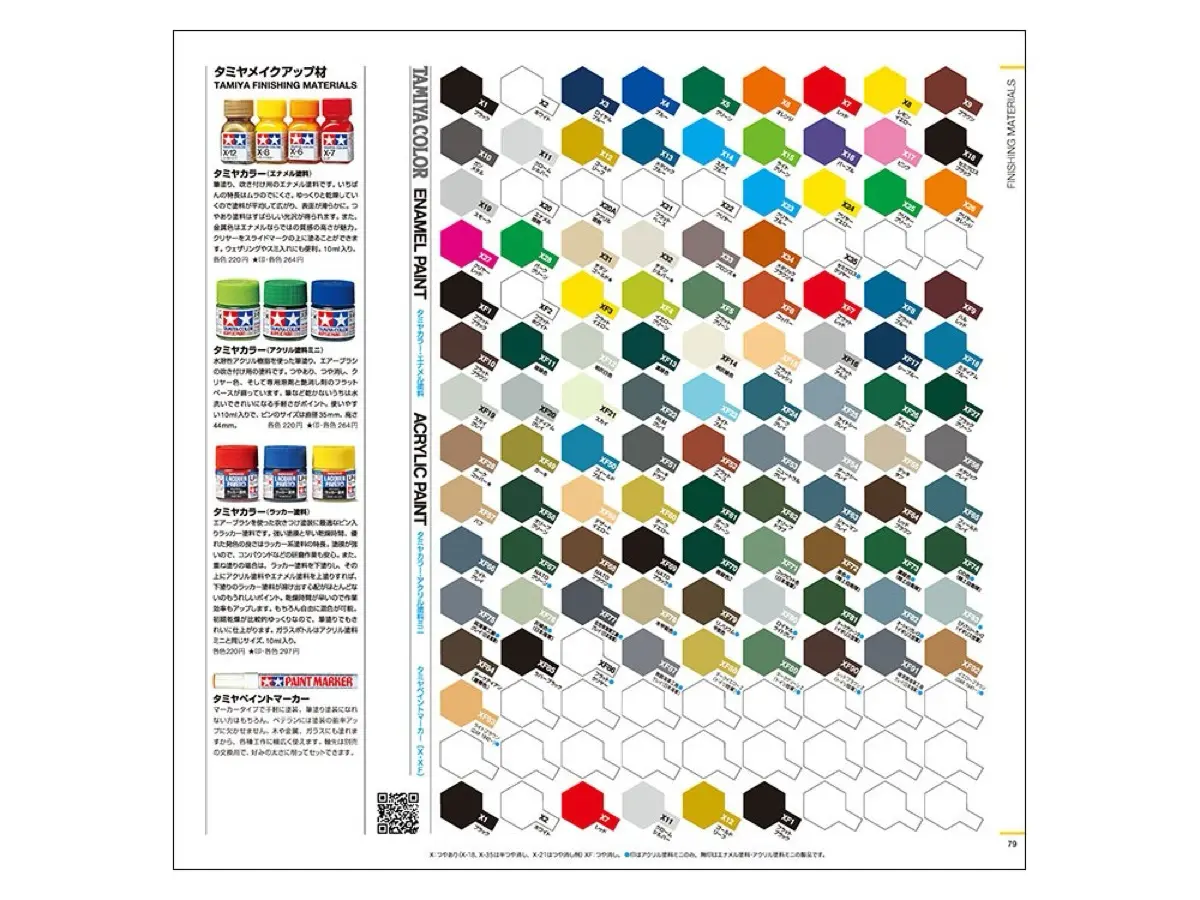 タミヤカラーはビン入り塗料、スプレー塗料、マーカータイプ塗料の色見本を掲載