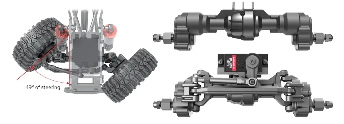 目指したハイステアジオメトリを実現するために、フロントアクスルハウジング、フロントポータル、ステアリングリンクを再設計し、フロントポータルにユニバーサルシャフトを追加しました。この新しい「ハイステア」(HS)設計により、ステアリング性能が向上し、Cハブの地上高も向上し、このミニクローラーは従来モデルよりもさらに優れたステアリング性能を実現しています。