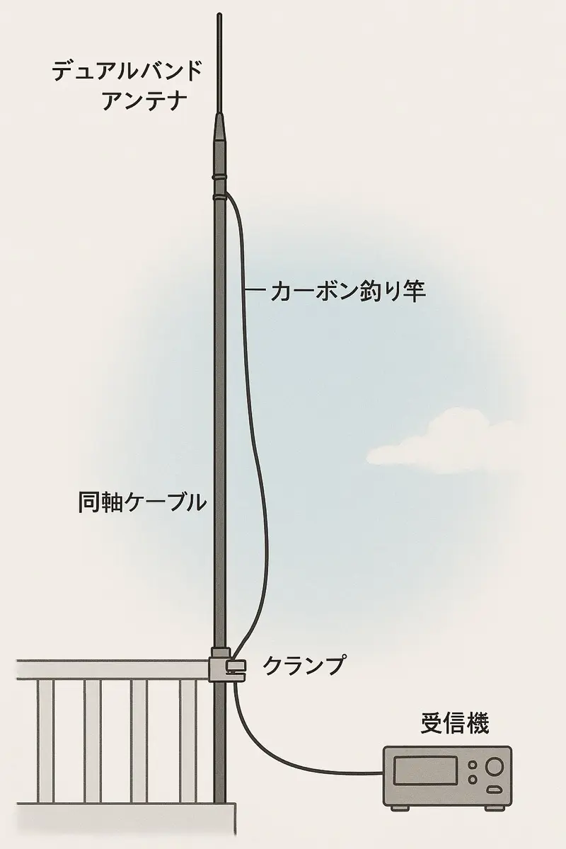 カーボン釣り竿を延ばして、竿自体をアンテナにするか、ホイップアンテナを竿の先端に付けてケーブルで引っ張る方法。
